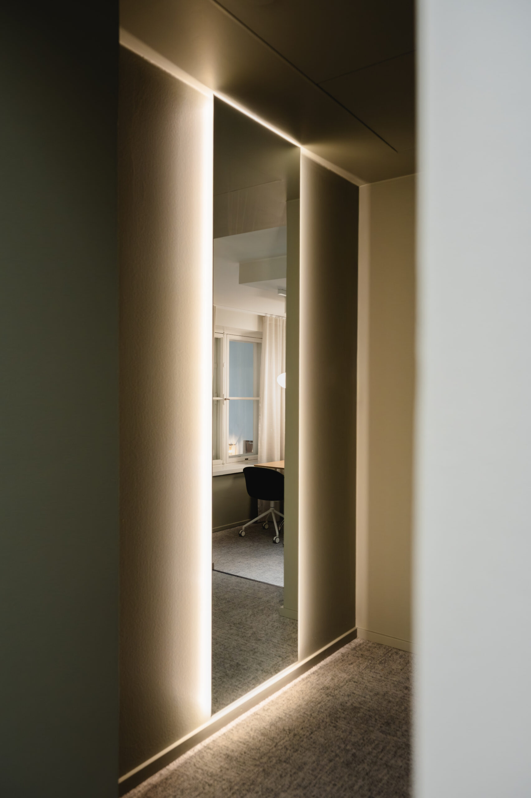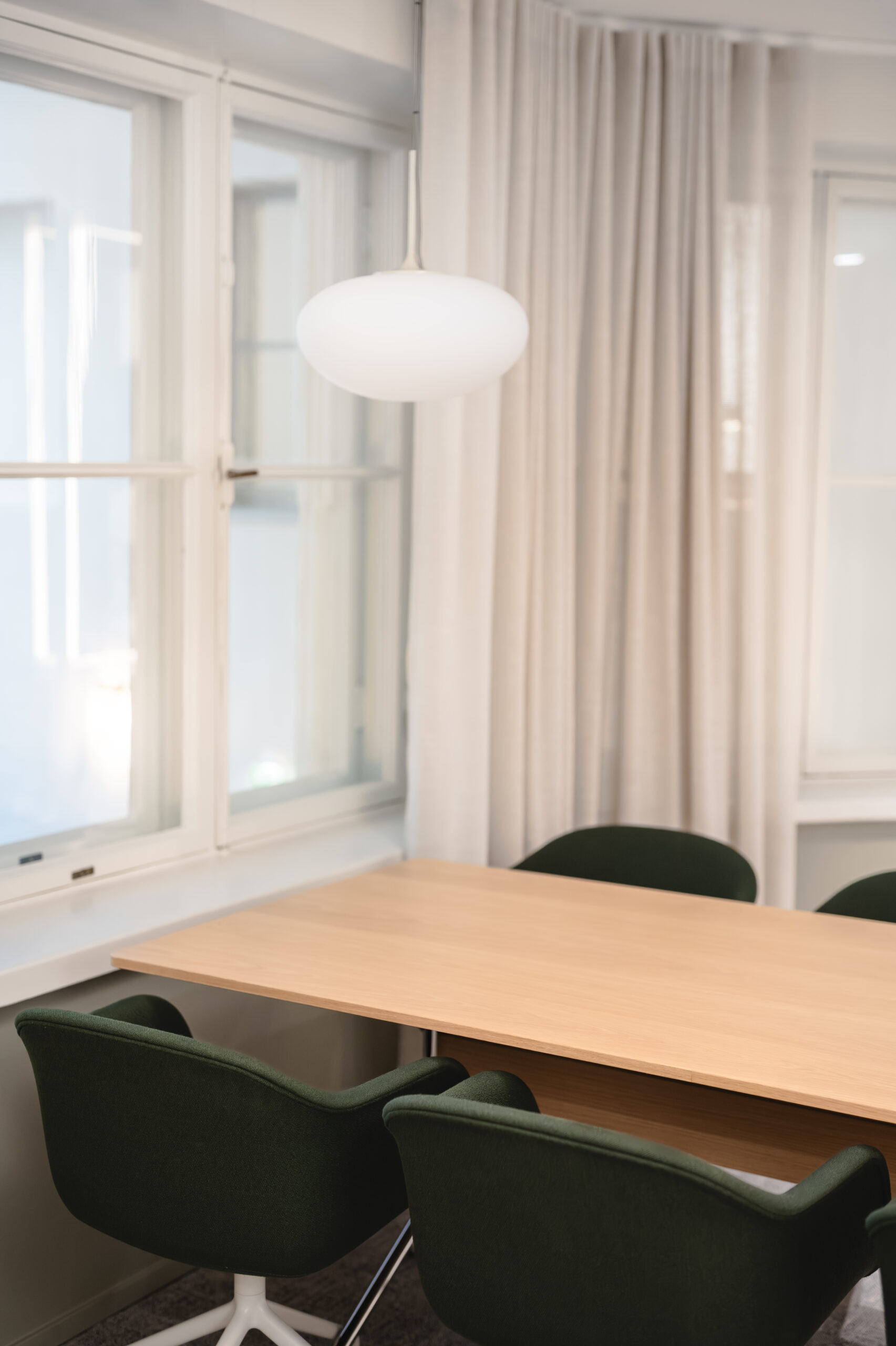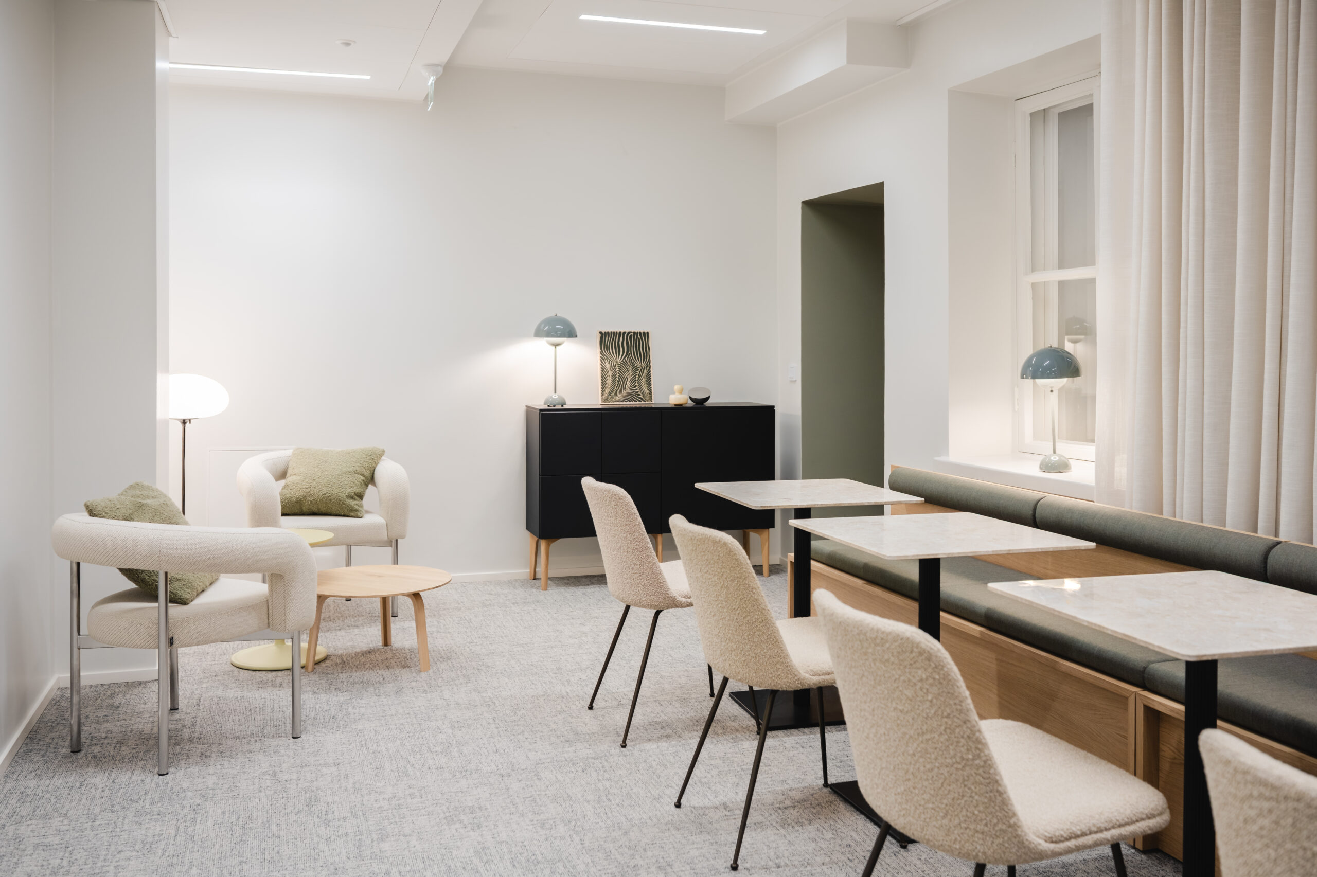 Suurin muutos saatiin aikaan tasapainoisella sävymaailmalla ja ryhdikkäillä tekstiileillä. Värien inspiraationa toimi vanhat kaakeliuunit ja rakennuksen estetiikka. Lopputuloksena syntyi kodinomainen ja hyvin lähestyttävä työympäristö, jossa yrityksen työntekijät viihtyvät huomattavasti aiempaa paremmin ja lisäksi tila toimii heille myös valttikorttina sekä uusien että vanhojen asiakkaiden kohtaamisiin.