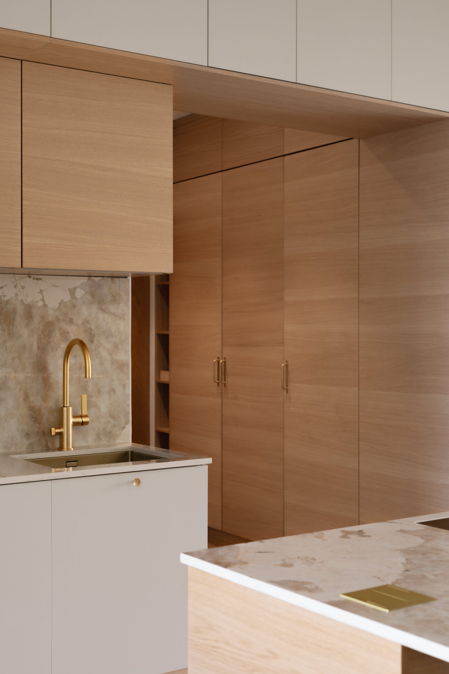 Ratkaisu löytyi huolellisesta suunnittelusta ja tilan käytön optimoinnista. Remontissa purettiin lähes kaikki kevyet väliseinät ja keittiö siirrettiin keskelle asuntoa entiseen aulaan. Näin vapautui tilaa arjen tärkeimmille toiminnoille; eteiselle, kylpyhuoneelle sekä lasten huoneelle ja samalla saatiin tilava ja toimiva keittiö.